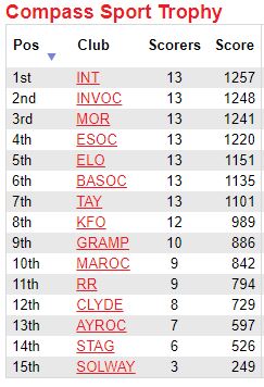The rules are too complicated to summarise here so all you need to know is that Gramp falls into the category of small club, as do all the other Scottish clubs bar FVO, so the top 13 scorers across a broad spread of courses by age class count towards the total score. In other words you need a lot of folk in it, running in as many different classes as possible, to win it.